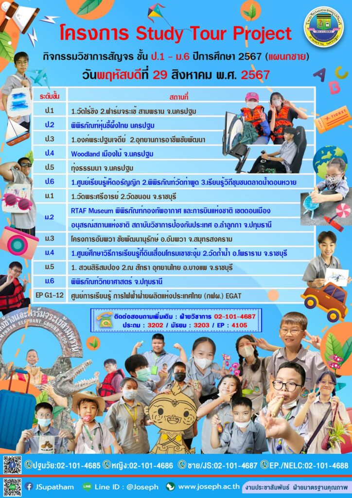 Homepageประกาศกิจกรรมวิชาการสัญจร Study Tour Project 2024 ประกาศ กิจกรรมวิชาการสัญจร Study Tour Project 2024 admin1 Posted on 28 สิงหาคม 2024 LEAVE A RESPONSE ยกเลิกการตอบอีเมลของคุณจะไม่แสดงให้คนอื่นเห็นความเห็น ชื่อ อีเมล เว็บไซต์ บันทึกชื่อ, อีเมล และชื่อเว็บไซต์ของฉันบนเบราว์เซอร์นี้ สำหรับการแสดงความเห็นครั้งถัดไป admin1 View all posts แนะแนวเรื่อง Previous Postสัปดาห์วิทยาศาตร์ แผนกอนุบาล Next Postการทดสอบ [TEDET] ระดับชั้นประถมศึกษาปีที่ 2 – ระดับชั้นมัธยมศึกษาปีที่ 3 You Might Also Like ประกาศ 💛💚 J o s e p h’s D a y 💛💚 admin1 18 มีนาคม 2025 ประกาศ MINI CONCERT @JOSEPH UPATHAM SCHOOL admin1 3 เมษายน 2025 กิจกรรม พิธีบูชาขอบพระคุณ โอกาสเปิดปีการศึกษา 2567 admin1 5 มิถุนายน 2024 ประกาศ การเรียน รด. สัปดาห์ที่ 7 admin1 20 ตุลาคม 2025
