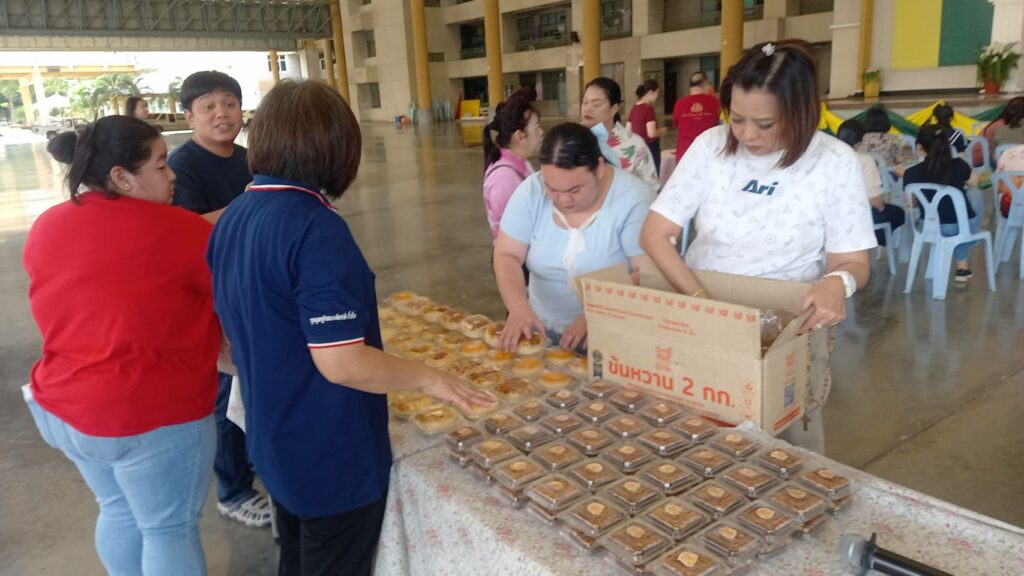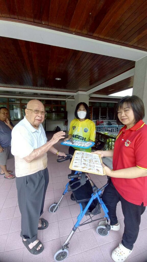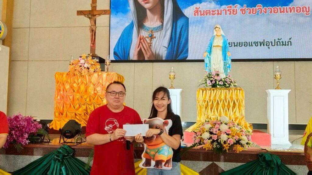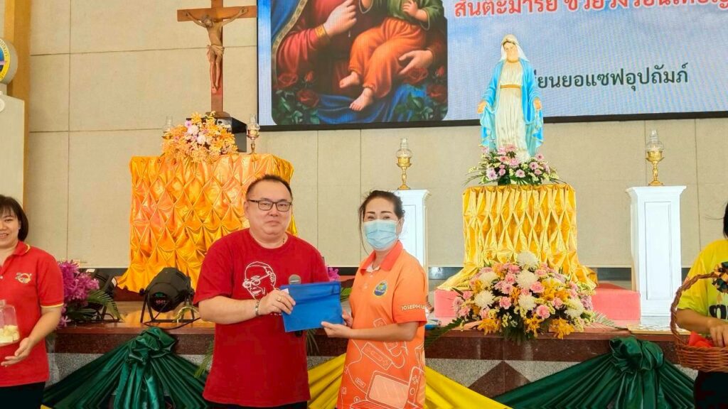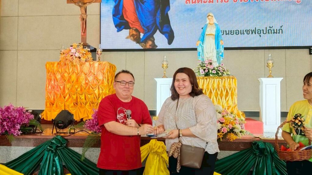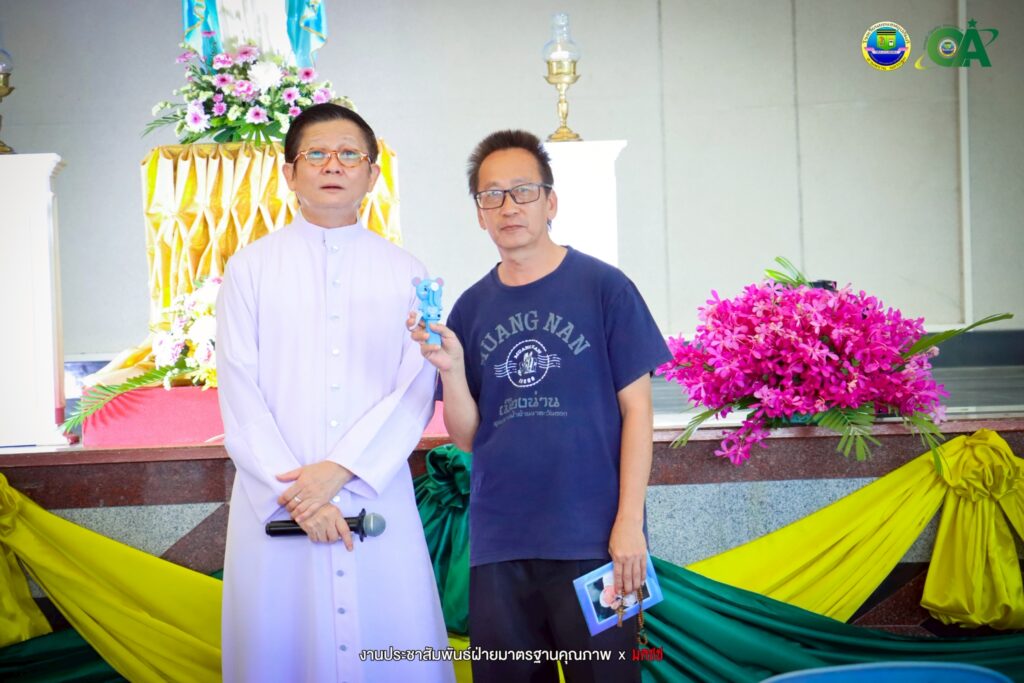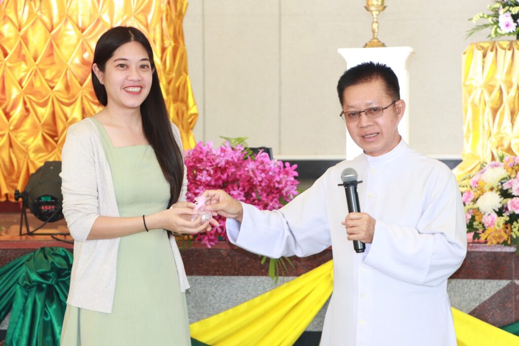 คุณพ่อธนบูรณ์ พูนผล มอบกางแขนที่ระลึกให้กับผู้มาร่วมสวดทุกท่านและมาสเตอร์ สามัคคี กิจเจริญ มอบของขวัญจากผู้สนับสนุนผู้มีน้ำใจดีให้แก่ผู้โชคดีทั้ง 8 ท่าน