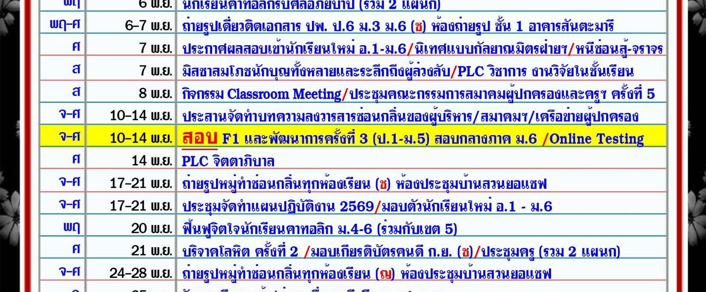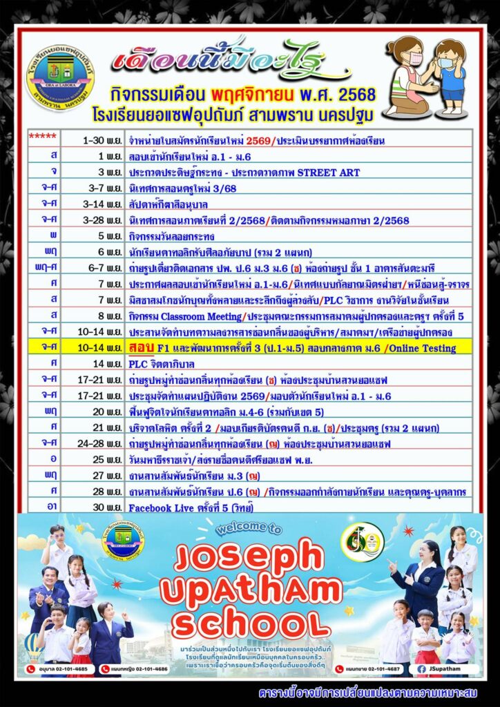 Homepageประกาศปฎิทินกิจกรรมเดือนพฤศจิกายน ประกาศ ปฎิทินกิจกรรมเดือนพฤศจิกายน admin1 Posted on 3 พฤศจิกายน 2025 admin1 View all posts แนะแนวเรื่อง Previous Postวจนพิธีกรรมไว้อาลัยแด่สมเด็จพระนางเจ้าสิริกิติ์พระบรมราชินีนาถ พระบรมราชชนนีพันปีหลวงและระลึกถึงผู้ล่วงลับ Next Postการเรียน รด. สัปดาห์ที่ 8 You Might Also Like ประกาศ กิจกรรมเดือนมีนาคม – พฤษภาคม 68 admin1 27 กุมภาพันธ์ 2025 กิจกรรม พิธีบูชาขอบพระคุณ โอกาสเปิดปีการศึกษา 2567 admin1 5 มิถุนายน 2024 ประกาศ ขอเชิญชมการแสดงนาฎยศาลา หุ่นละครเล็กโจหลุยส์ ณ โรงเรียนยอแซฟอุปถัมภ์ admin1 17 กรกฎาคม 2025 ประกาศ โครงการ Study Tour Project admin1 16 กรกฎาคม 2024