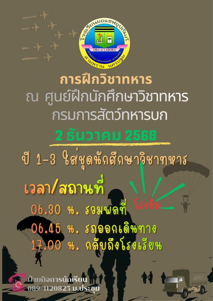 📌วันอังคารที่ 2 ธันวาคม พ.ศ. 2568⏰ (เวลา 06.30 – 17.00 น.) การเรียน รด. สัปดาห์ที่ 10 👉นักศึกษาวิชาทหารชั้นปีที่ 1 – 3 เข้ารับการฝึก 👉 ต้องเรียน ร.ด. นะจ๊ะ 🔰📌แต่งเครื่องแบบ ร.ด. 💥🕹ณ ค่ายทองฑีฆายุ ศูนย์ฝึกนักศึกษาวิชาทหาร กรมการสัตว์ทหารบก จ.นครปฐม