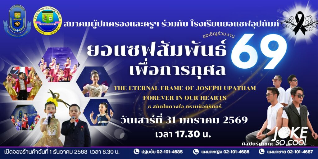 Homepageประกาศไม่มีตารางเรียนวันเสาร์เนื่องจากมีงานยอแซฟสัมพันธ์ 69 ประกาศ ไม่มีตารางเรียนวันเสาร์เนื่องจากมีงานยอแซฟสัมพันธ์ 69 admin1 Posted on 30 มกราคม 2026 admin1 View all posts แนะแนวเรื่อง Previous Postประชาสัมพันธ์เส้นทางจราจร จุดจอดรถ ผังที่นั่ง และกำหนดการจัดงานยอแซฟสัมพันธ์‘69 เพื่อการกุศล You Might Also Like ประกาศ admin1 2 ตุลาคม 2024 ประกาศ Classroom Meeting admin1 6 พฤศจิกายน 2025 ประกาศ ประกวดพานไหวัครู admin1 4 มิถุนายน 2025 ประกาศ ประกาศโรงเรียนยอแซฟอุปถัมภ์ เรื่อง แนวทางปฏิบัติและมาตรการด้านการจัดการจราจรภายในโรงเรียนและหน้าโรงเรียน admin1 3 พฤศจิกายน 2025