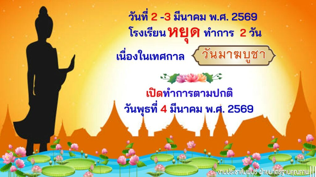 Homepageประกาศโรงเรียน หยุด ทำการ 2 วัน เนื่องในเทศกาล วันมาฆบูชา ประกาศ โรงเรียน หยุด ทำการ 2 วัน เนื่องในเทศกาล วันมาฆบูชา admin1 Posted on 26 กุมภาพันธ์ 2026 admin1 View all posts แนะแนวเรื่อง Previous Postพิธีมอบวุฒิบัตร 💛💚 “ บัณฑิตน้อย ” 💛💚 You Might Also Like ประกาศ ตารางเรียน SUMMER 2025 admin1 26 กุมภาพันธ์ 2025 ประกาศ ปฏิทินการศึกษาระดับการศึกษาขั้นพื้นฐาน ปีการศึกษา 2567 admin1 17 ธันวาคม 2024 ประกาศ ประกาศรายชื่อนักเรียนที่มีสิทธิ์เรียนในแผนการเรียน Joseph Gifted ระดับชั้นประถมศึกษาปีที่ 1 ปีการศึกษา 2569 admin1 3 พฤศจิกายน 2025 ประกาศ ประกาศหยุดการเรียนกราสอน 1 วัน admin1 31 พฤษภาคม 2024